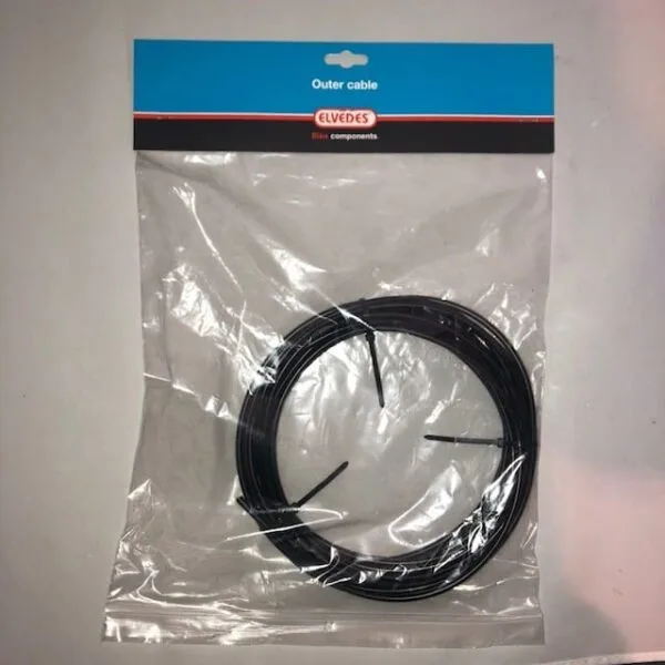 Zwarte buitenkabel van het merk Elvedes. Dit is een rol van 10 meter met een totale diameter van 5mm. De diameter van de binnenkant van de kabel is 3.5 mm. De buiten remkabel is gemaakt van plastic. We verkopen buitenkabel ook in een rol van 25 meter KLIK HIER of 50 meter KLIK HIER.